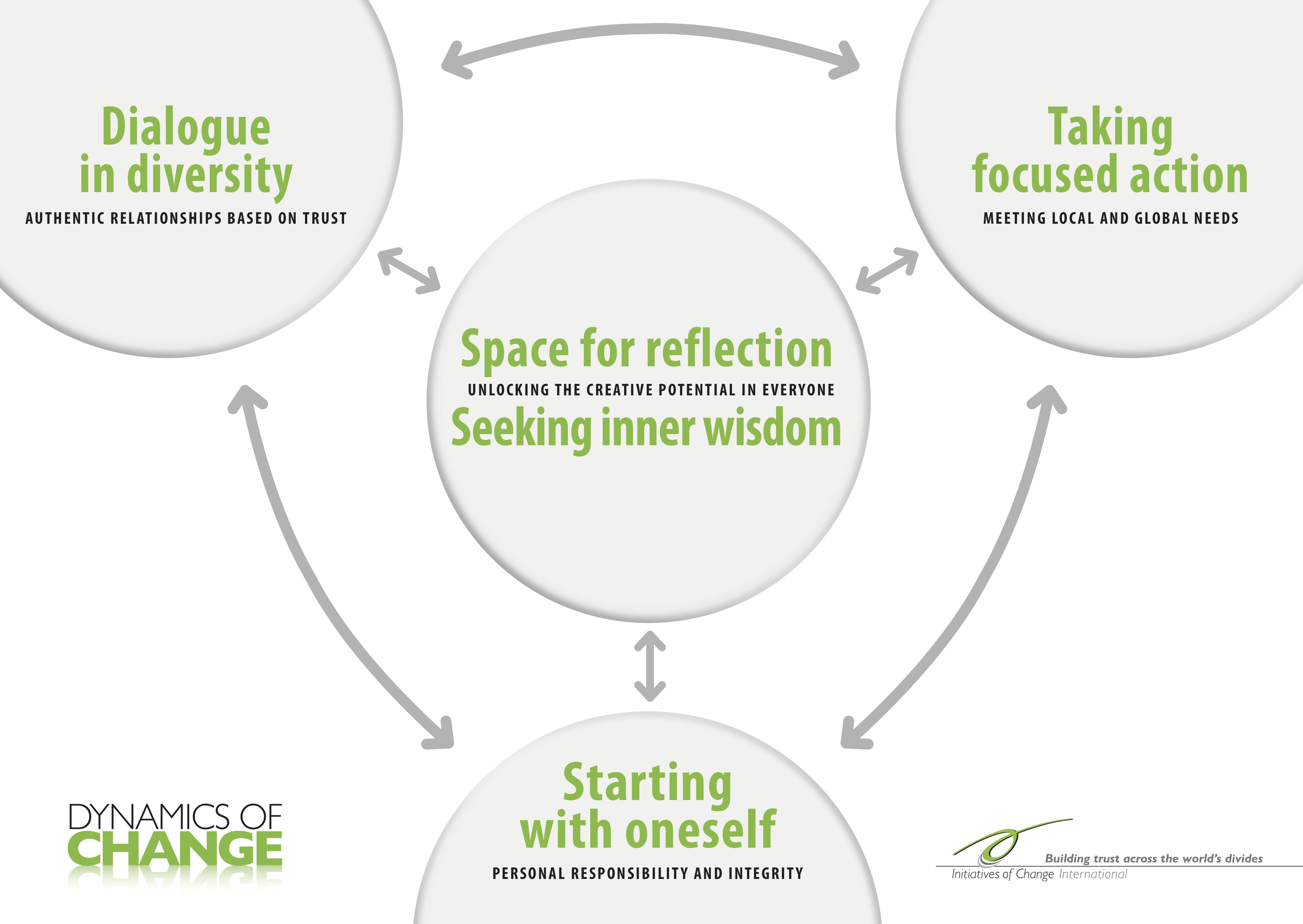 We believe an honest look at one’s own motives and behavior is often the start of personal transformation. Across the world's many cultures you will find values that serve to guide the individual and the community. Of the many, IofC singles out four values as our foundation for self-reflection: Honesty, Unselfishness, Purity and Love.